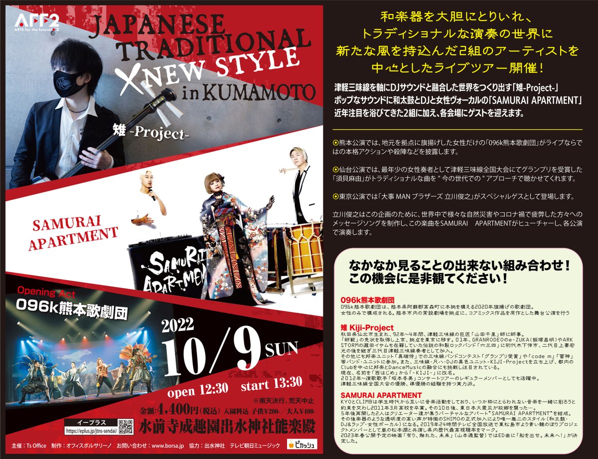 懐古的な場所で伝統楽器を使い新しい音楽に挑戦するNEWアーティストたちをクローズアップするコンサートメインにサムアパが選出。熊本/仙台/東京で公演
